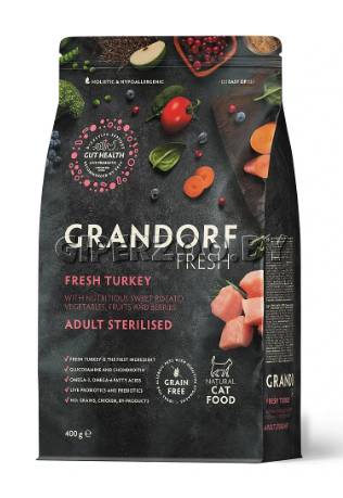 Grandorf Fresh Adult STERILISED (свежая индейка с бататом) — беззерновой корм с живыми пробиотиками. Для взрослых стерилизованных кошек, кастрированных котов от 1 года и пожилых кошек с чувствительным пищеварением или склонных к аллергии.