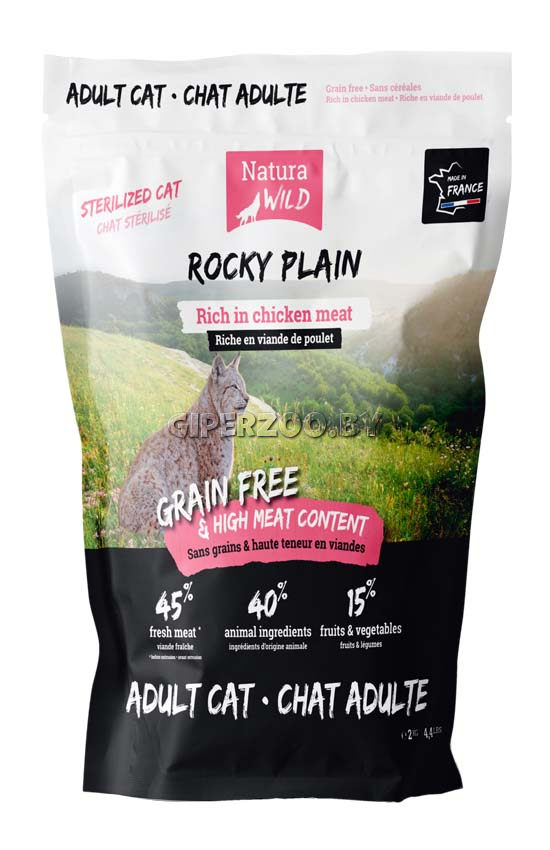 Беззерновой корм для стерилизованных кошек с курицей Rocky Plain Sterilised Chicken (\"Каменистая Равнина\"). Полнорационный корм для стерилизованных взрослых кошек, богатый куриным мясом. Ваша кошка — хищник, которому необходимо удовлетворять свои физиологические потребности в животных белках. Однако, поскольку она стерилизован, ей нужен подходящий рацион, который может предотвратить увеличение веса и развитие мочекаменной болезни. Специально адаптированные рецепты для стерилизованных взрослых кошек содержат 45 % свежего куриного мяса и 40 % ингредиентов животного происхождения. Эти гранулы особенно богаты витаминами и содержат 15% фруктов и овощей, таких как свекла, цикорий, гранат и т. д. При этом содержат меньше опасных минералов, вызывающих мочекаменную болезнь, и пониженное содержание жира, для профилактики ожирения.