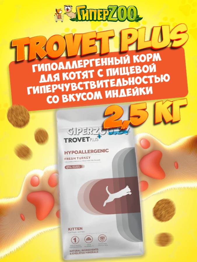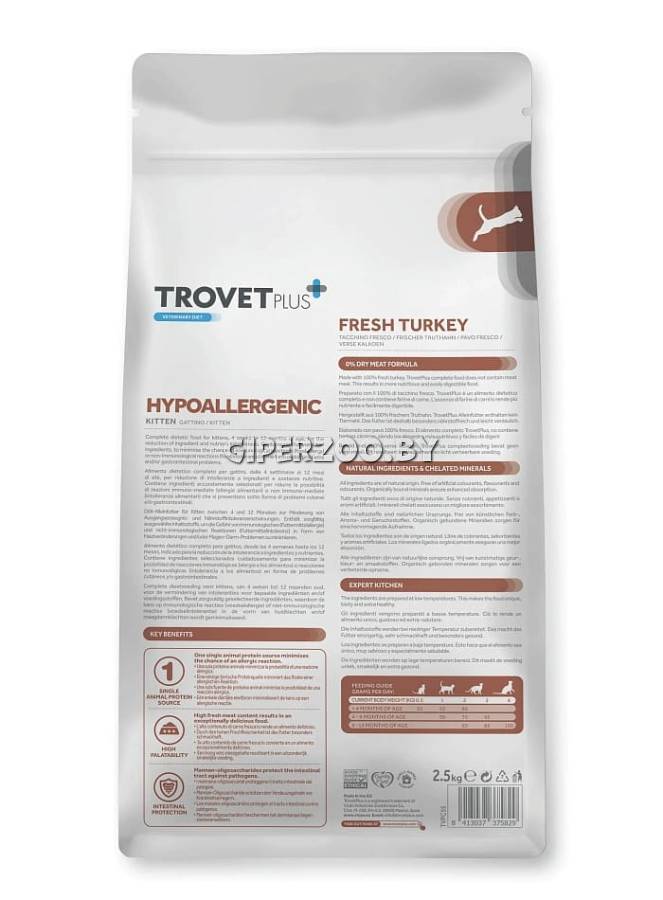 Сухой корм для котят Trovet Plus Kitten Hypoallergenic (Индейка) – полноценный гипоаллергенный корм для котят от 4 недель до 12 месяцев, предназначен для снижения непереносимости ингредиентов и питательных веществ.