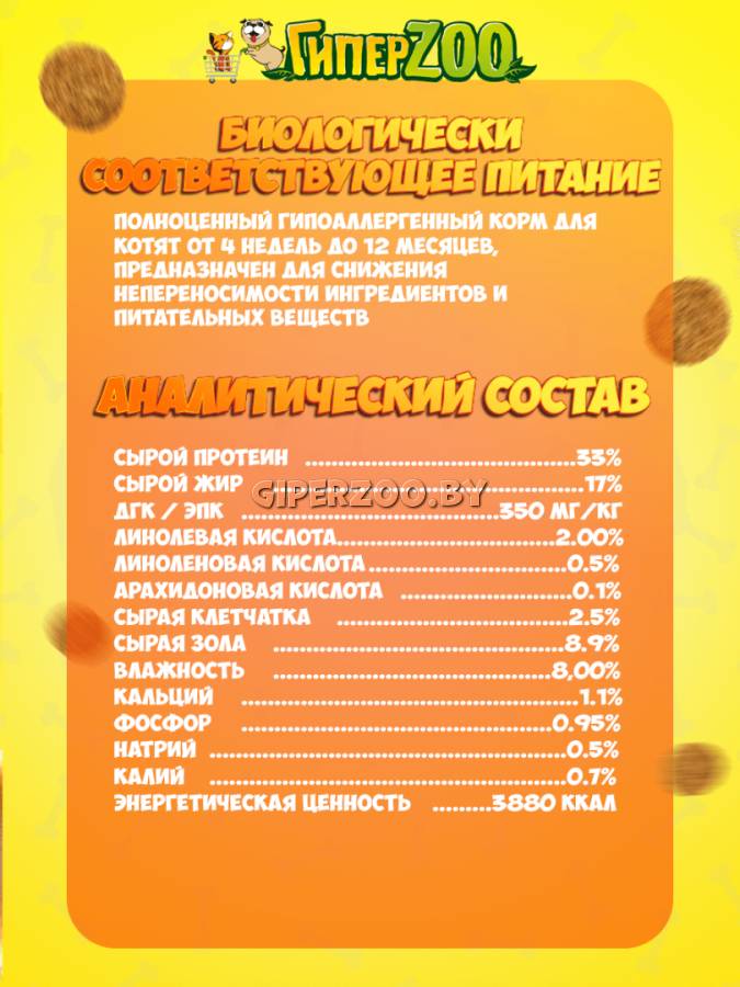 Состав: свежеприготовленная индейка 58% (из 100 кг свежеприготовленной индейки получается 100 кг продукта), экструдированный рис, картофельный белок, рисовый белок, семена льна (природный источник ω3 жирных кислот), гидролизованные из печени птицы, дрожжи (Saccharomyces cerevisiae), птичий жир (защищенный натуральными токоферолами), монокальцийфосфат, карбонат кальция, яблочная клетчатка, рыбий жир (защищенный натуральными токоферолами), хлорид натрия, инулин (источник фруктоолигосахаридов (ФОС)) 1000 мг/кг, гидролизованная клеточная стенка дрожжей (источник маннан-олигосахаридов (МОС)) 1000 мг /кг, водоросли ламинарии 500 мг/кг, сушеная капуста 500 мг/кг, календула (богатая каротинами) 100 мг/кг, розмарин 100 мг/кг, зеленый чай 100 мг/кг.