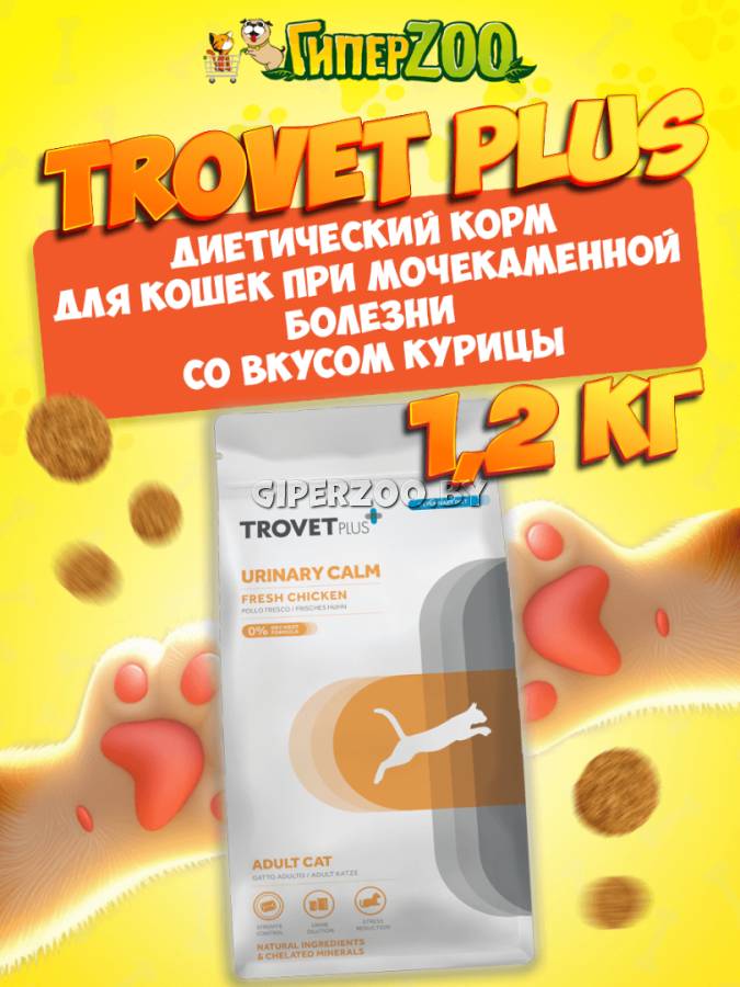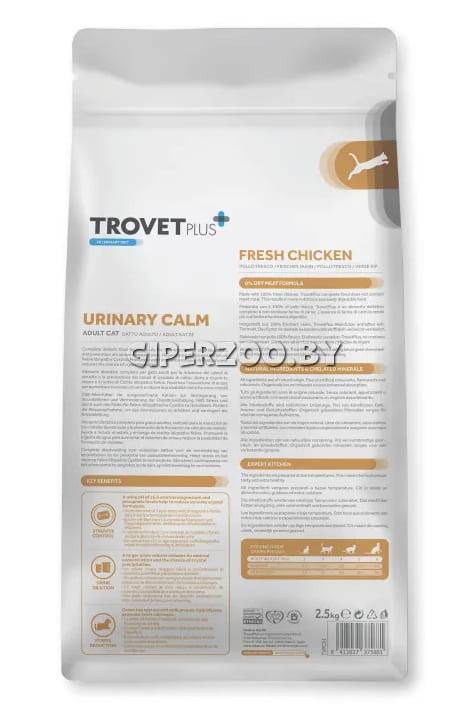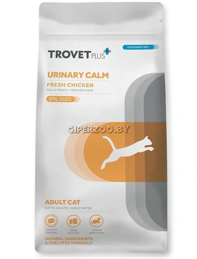 Сухой корм для кошек Trovet Plus Urinary Calm Cat (Курица) – полноценный диетический корм для взрослых кошек, подходящий для уменьшения струвитных камней. Помогает снизить стресс и риск развития идиопатического цистита у кошек.