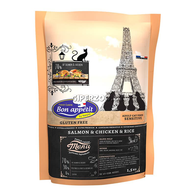 Bon Appétit Adult Sensitive, 1,5 кг - это повседневный корм для взрослых кошек с чувствительным пищеварением. Представляет собой комплексное сбалансированное питание, обеспечивающее питомца необходимыми витаминами и микроэлементами при особых потребностях его организма. Поможет взрослым кошкам оставаться в форме. Эти вкусные гранулы обеспечат вашу кошку полноценными и сбалансированными питательными веществами. Корм богат животным белком и превосходными антиоксидантами для поддержания здоровья сердца и иммунной системы. Этот рецепт является идеальной пищей для кошек с чувствительным пищеварением, он не содержит глютена и приготовлен из тщательно отобранных высококачественных ингредиентов.