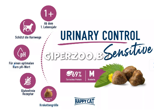 Формула корма для кошек Happy Cat Sensitive Urinary Control была разработана экспертами по питанию специально для кошек с чувствительными мочевыводящими путями, склонными к проблемам с мочевыводящими путями. Мочевыводящие пути защищены более высоким содержанием метионина, что обеспечивает большее подкисление мочи. Кроме того, в кормах снижается содержание таких минералов как кальций, фосфор и магний. Это дополнительно защищает мочевыводящие пути чувствительных кошек.