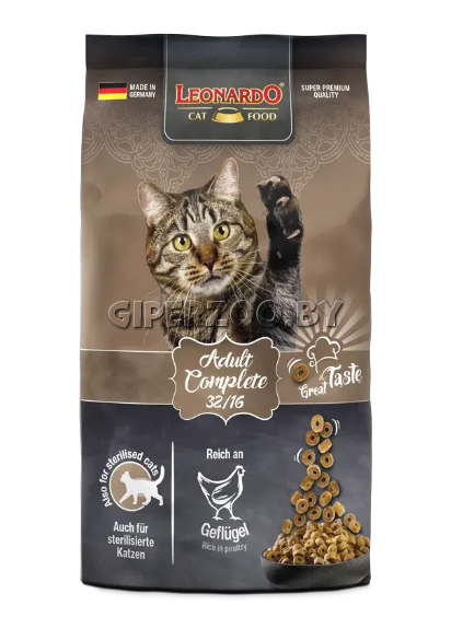 Leonardo Complete 32/16 — это сухой корм супер-премиум класса для взрослых кошек старше 1 года с пониженной активностью. Он предотвращает проблемы с весом и препятствует образованию жировых отложений.