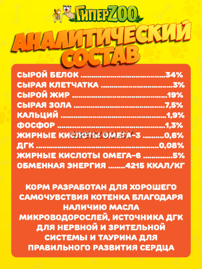 Аналитический Сырой белок: 34%, Сырая клетчатка: 3%, Сырой жир: 19%, Сырая зола: 7,5%. Кальций: 1,9%, фосфор: 1,3%, жирные кислоты Омега-3: 0,6%, ДГК: 0,08%, жирные кислоты Омега-6: 5%. Обменная энергия 4215 ккал/кг.