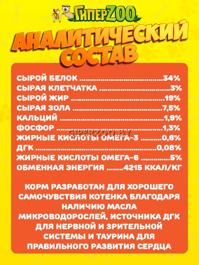 Аналитический Сырой белок: 34%, Сырая клетчатка: 3%, Сырой жир: 19%, Сырая зола: 7,5%. Кальций: 1,9%, фосфор: 1,3%, жирные кислоты Омега-3: 0,6%, ДГК: 0,08%, жирные кислоты Омега-6: 5%. Обменная энергия 4215 ккал/кг.