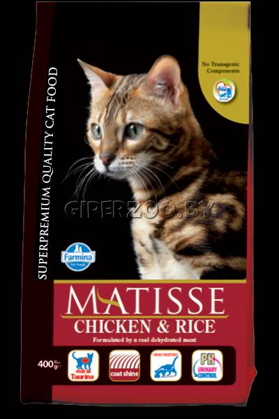 Farmina Matisse Adult Chicken & Rice - корм для взрослых кошек с курицей и рисом Полнорационный и сбалансированный корм для взрослых кошек. Ингредиенты: Дегидратированное мясо курицы (32%), рис (25%), кукуруза, дегидратированная рыба, куриный жир, гидролизат животных белков, пульпа сахарной свеклы, рыбий жир, растительное масло, кукурузный глютен, дегидратированные цельные яйца, хлорид натрия, хлорид калия, сульфат кальция, дрожжи сухие пивные. Супер премиальный корм с отличной усвояемостью. Использование первоклассного мясного сырья позволяет получить легко усваиваемый корм с высокой вкусовой привлекательностью. Мясо ингредиент №1. Кошки, как строго мясоядные животные, нуждаются в большом количестве незаменимых аминокислот, источником которых является мясо.