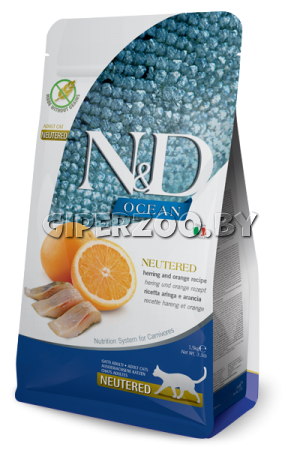 N&D GF OCEAN Cat Herring & Orange Adult Neutered - полнорационное беззерновое питание Океан для взрослых стерилизованных кошек и кастрированных котов (сельдь, апельсин).