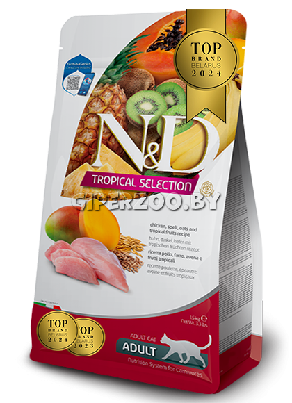 N&D Tropical selection - это новая линия кормов, разработанная Farmina, изготовленная из зерновых с низким гликемическим индексом (полбой и овсом) и различных тропических фруктов для хорошего самочувствия кошек и собак.