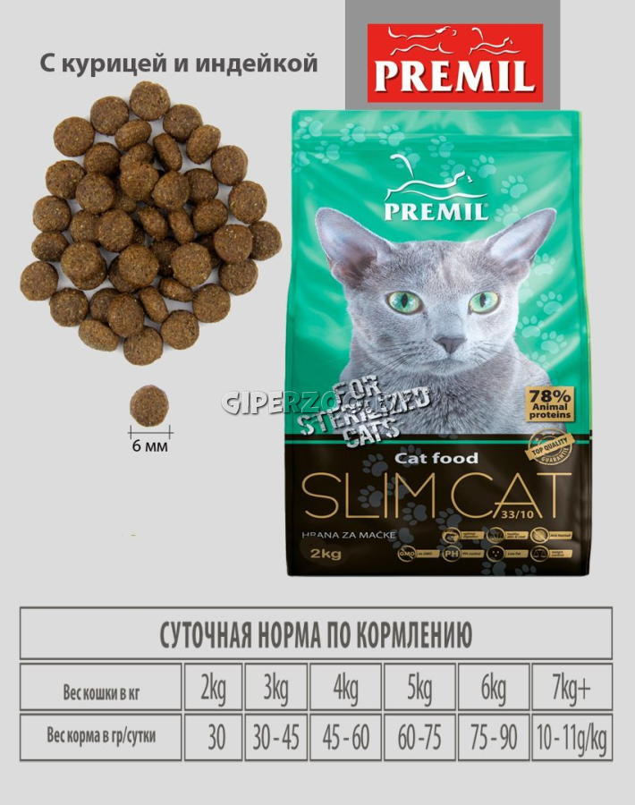 PREMIL Slim Cat SuperPremium (Премил СуперПремиум) Корм для стерилизованных кошек с мясом индейки и цыпленком, 2 кг