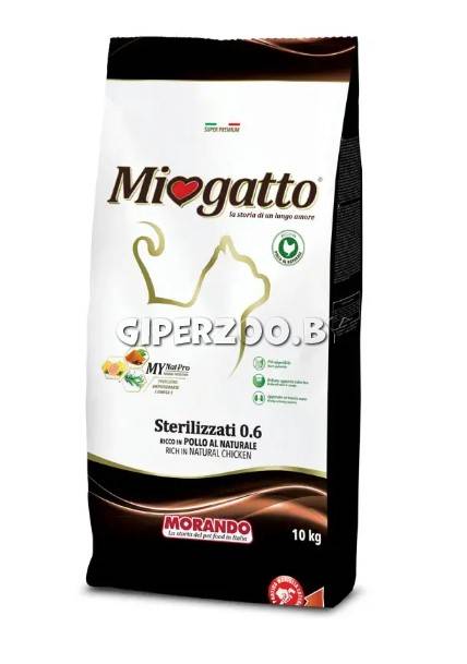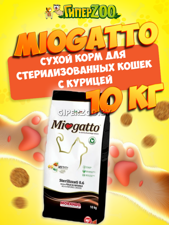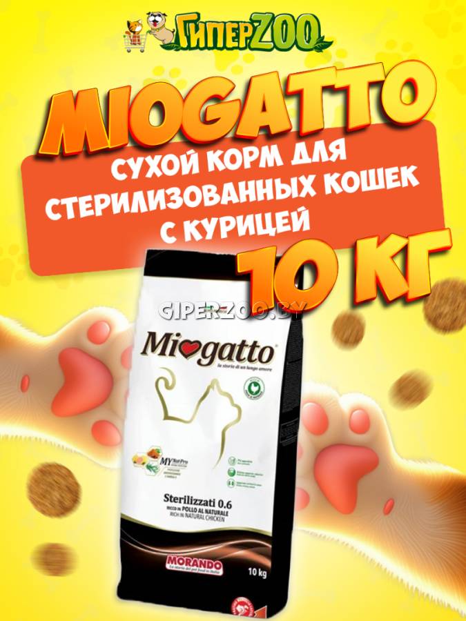 Сухой корм для стерилизованных кошек Miogatto Sterilizzati курица — полнорационный сбалансированный сухой корм суперпремиум класса с натуральным мясом курицы для кастрированных котов и стерилизованных кошек.