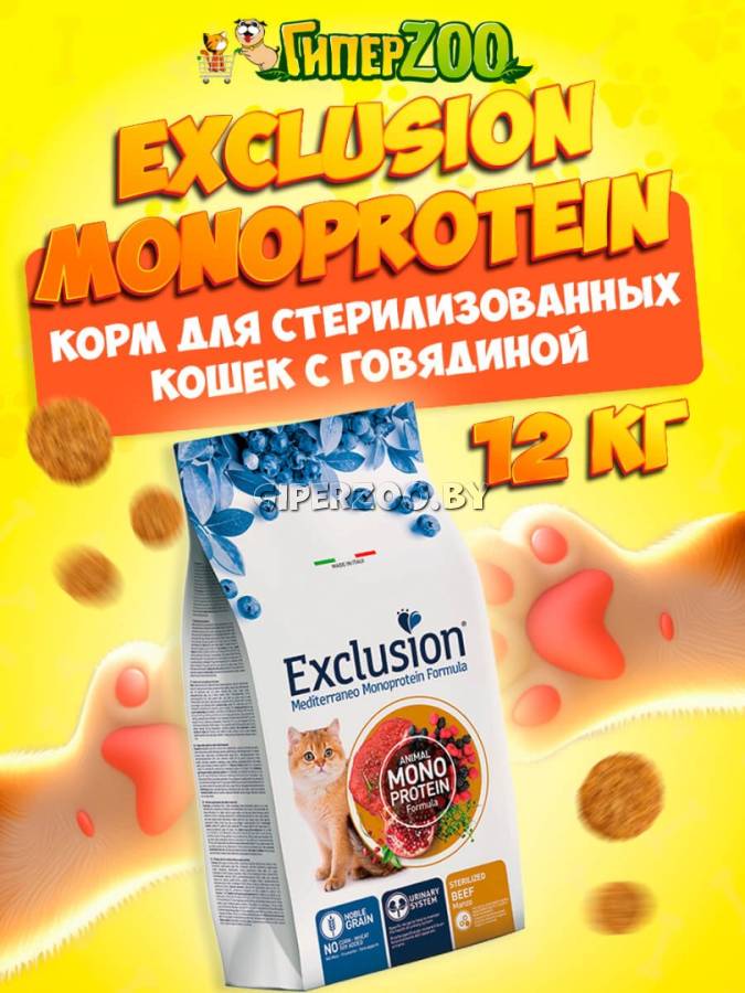 Сухой корм для котов EXCLUSION Monoprotein STERILIZED BEEF с говядиной, 12 кг - полнорационный сбалансированный сухой корм на основе высококачественного зерна и дегидрированного монопротеина животного происхождения.