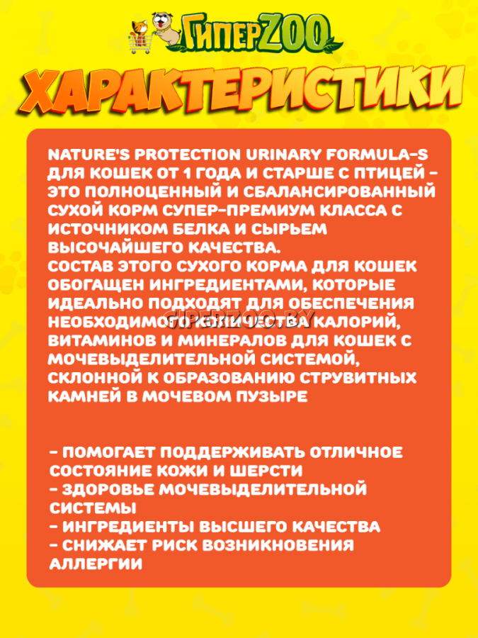 Nature’s Protection Urinary Formula-S — это специализированное питание, которое помогает поддерживать здоровье мочевыделительной системы вашей кошки, снижая риск образования струвитов и обеспечивая её необходимыми питательными веществами для активной и здоровой жизни.