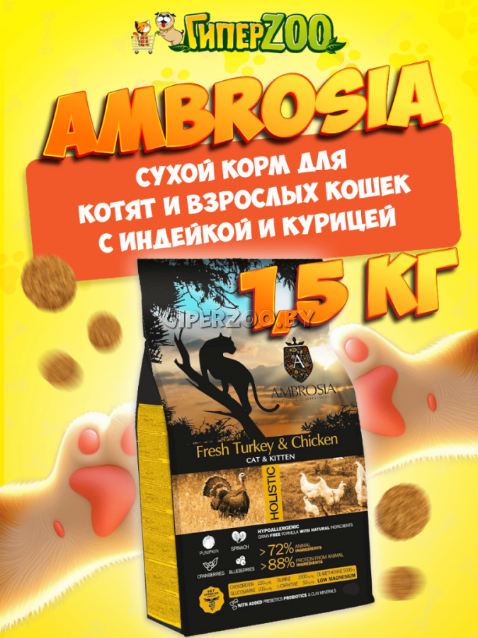 Ambrosia Cat&Kitten (Индейка, курица) - сочетает в себе два источника птичьего белка, получаемого из свежего филе индейки, а также дегидратированной курицы и отборных фруктов и овощей. Включает пребиотики и пробиотики для улучшения пищеварения и иммунной системы, хондроитин и глюкозамин для защиты суставов, а также таурин и L-карнитин для развития мозга, сердечно-сосудистой и мышечной систем. Рецепт корма для всех жизненных этапов содержит все необходимые ингредиенты для правильного роста котят и при этом не является слишком калорийным для взрослых кошек.