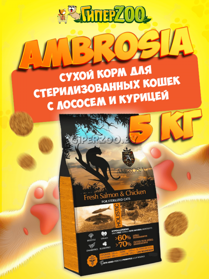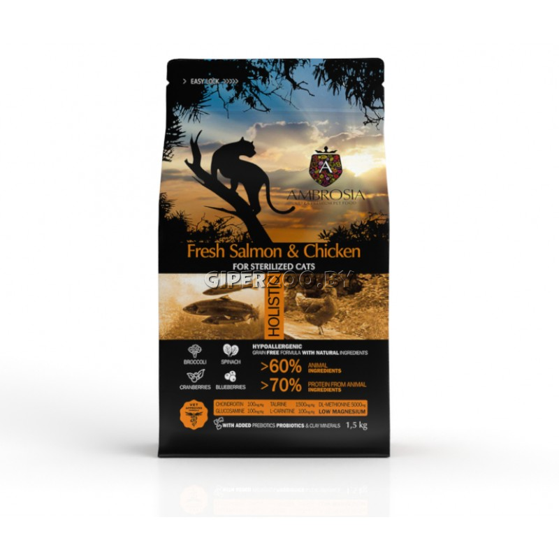 Ambrosia Sterilized Cat (Лосось, курица) - сочетает в себе легко усваиваемый рыбный белок, получаемый из свежего филе лосося, а также дегидрированную курицу с высоким содержанием белка и отборные фрукты и овощи. Этот рецепт разработан для стерилизованных кошек с низким содержанием магния и DL-метионина для предотвращения образования струвитных камней и защиты мочевыделительной системы. В состав также входят пребиотики и пробиотики для улучшения пищеварения и иммунной системы, хондроитин и глюкозамин для защиты суставов, а также таурин и L-карнитин для улучшения развития мозга и сердечно-мышечной системы.