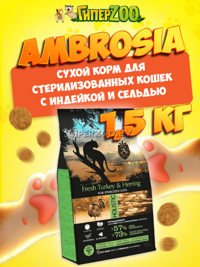 Ambrosia Cat Kitten (Индейка, сельдь) - сочетает богатое белком свежее филе индейки с дегидрированной сельдью, содержащей Омега-3, и отборными фруктами и овощами. Рецепт разработан для стерилизованных кошек с низкой активностью, содержащих мало жира для предотвращения набора веса, низкое содержание магния и DL-метионина для предотвращения образования струвитных камней. В состав также входят пребиотики и пробиотики для улучшения пищеварения и иммунной системы, хондроитин и глюкозамин для защиты суставов, а также таурин для улучшения развития мозга и сердечно-мышечной системы.