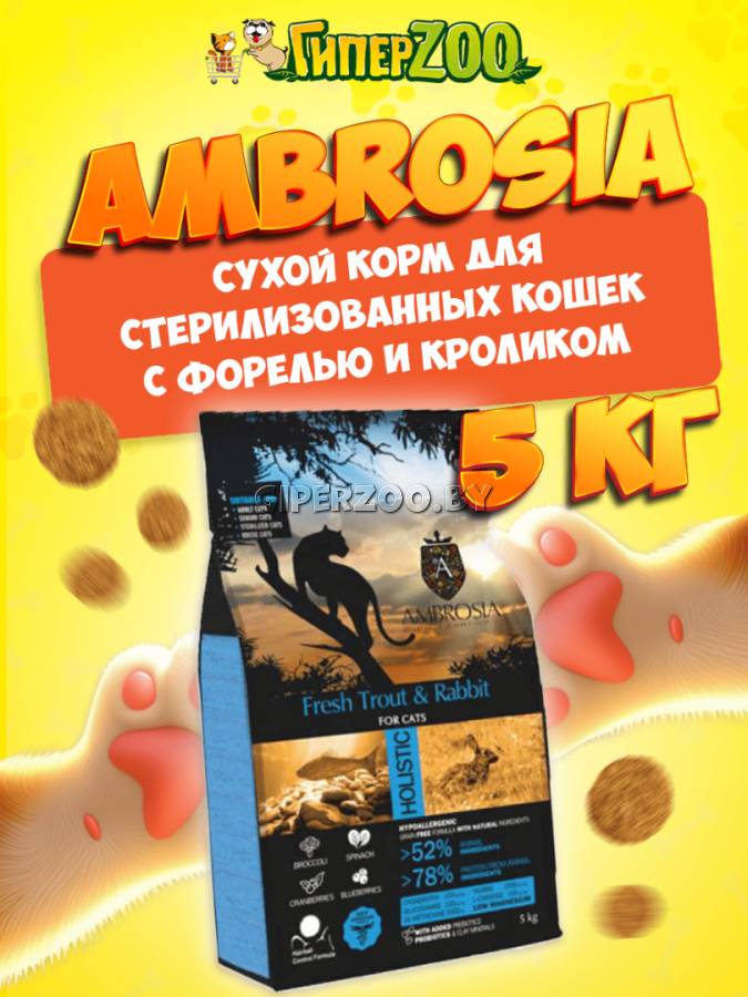 Корм сухой холистик "AMBROSIA GRAIN FREE" для стерилизованных кошек, свежие форель и кролик. Подходит для взрослых, пожилых, стерилизованных и страдающих от ожирения кошек.