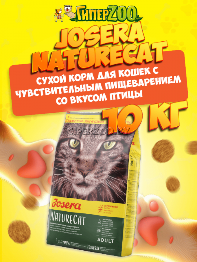 Сухой корм для кошек JOSERA NatureCat 10 кг - настоящее удовольствие для всех искателей приключений. Беззерновой корм содержит легкоусвояемое мясо домашней птицы и мясо лосося для котов и котят (от 6 месяцев) страдающих непереносимостью злаковых культур. Так же, данный корм подойдет для молодых, активных и привередливых кошек.