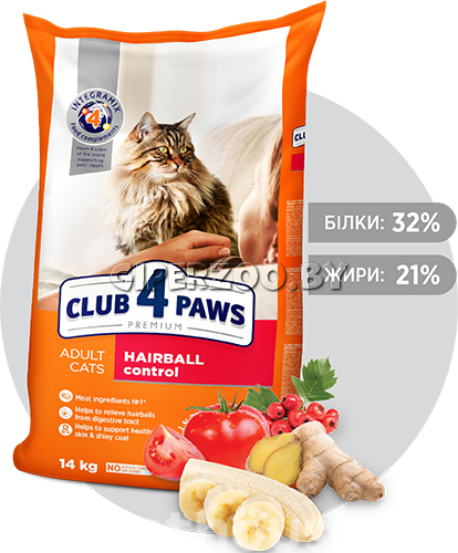 Club 4 Paws Premium Adult Cats Hairball Control Полнорационный сухой корм с эффектом выведения шерсти из пищеварительного тракта для взрослых кошек. Помощь в выведении шерсти для пушистых кошек. Сухой премиум-рацион содержит нерастворимую клетчатку (микрокристаллическая целлюлоза), которая выводит ворсинки шерсти из пищеварительного тракта и, благодаря своей грубой волокнистой структуре, стимулирует перистальтику кишечника. Питание содержит 24% куриной муки, которая имеет высокий коэффициент переваримости. Комплекс ненасыщенных жирных кислот Омега 3 + Омега 6 поддерживает кожу здоровой, а шерсть блестящей. Рацион обогащен формулой INTEGRAMIX для общей поддержки здоровья и иммунитета любимца. 32/21 - сбалансированная формула для ежедневного кормления Мясные ингредиенты №1 в составе Помощь в выведении шерсти из пищеварительного тракта Смесь токоферолов в качестве натурального антиоксиданта Витамины D3, E, B1, B5, микроэлементы и аминокислоты Омега 3 + Омега 6 для здоровой кожи и блестящей шерсти Формула INTEGR