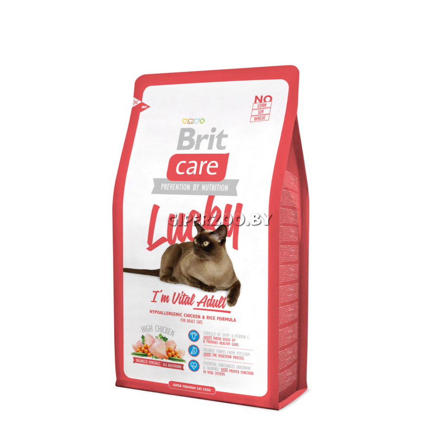 Brit Care Cat Lucky I'm Vital Adult (Курица) - это гипоаллергенный корм с курицей и рисом, подходящий для взрослых кошек всех пород.