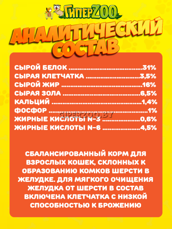 Омега-3 и 6 жирные кислоты заботятся о коже и шерсти. ФОС И МОС улучшают пищеварение и поддерживают естественный баланс микрофлоры.