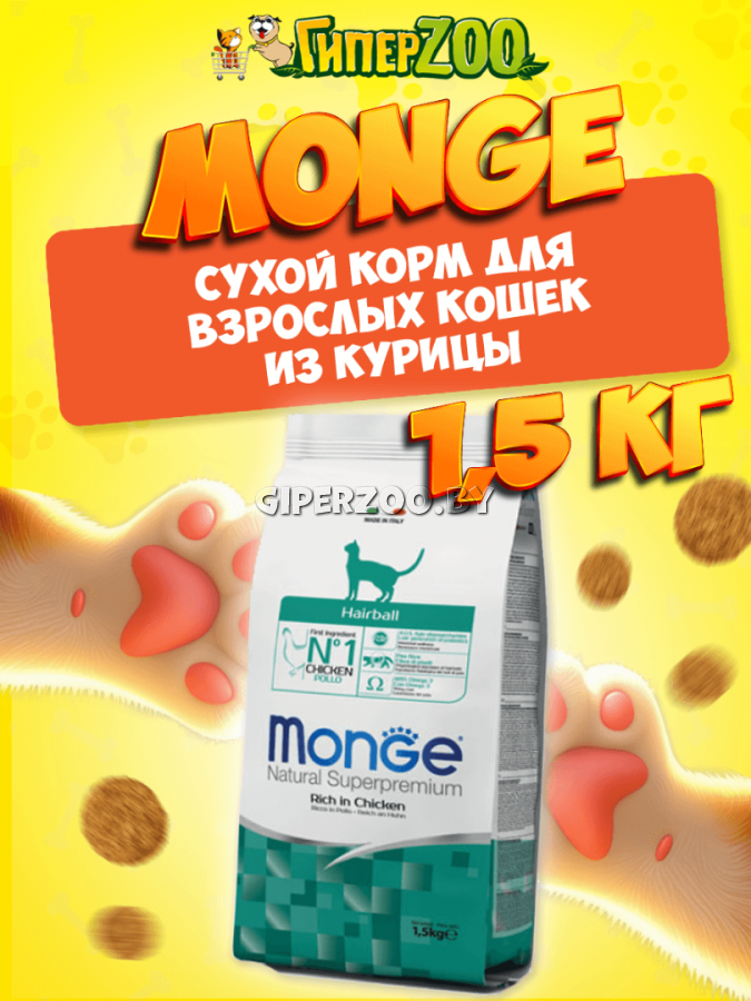 Сухой корм для котов Monge Cat Hairball, 1,5 кг - это сбалансированный корм для взрослых кошек, склонных к образованию комков шерсти в желудке. Повышенное содержание белков и L-карнитина помогает сохранить отличную физическую форму и активность. Для мягкого очищения желудка от шерсти в состав включена клетчатка с низкой способностью к брожению.