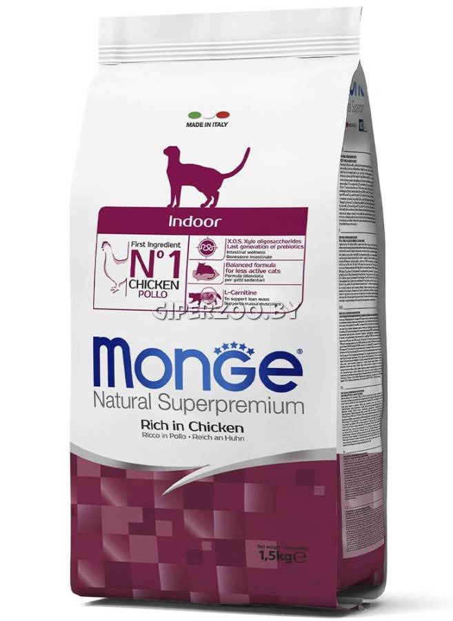 Monge Cat Indoor - это сбалансированный корм для взрослых домашних кошек с низким уровнем активности. Идеально подходит для введения в рацион кастрированных и стерилизованных животных, а также котов, склонных к полноте. L-карнитин помогает сохранить отличную физическую форму и активность, пониженное содержание жиров контролирует вес. Шелуха соевых бобов предотвращает ожирение, контролирует уровень сахара в крови и появление комков шерсти в желудке. Омега-3 и 6 жирные кислоты заботятся о коже и шерсти. ФОС И МОС улучшают пищеварение и поддерживают естественный баланс микрофлоры. Витамин А и таурин поддерживают здоровье сердца и глаз.
