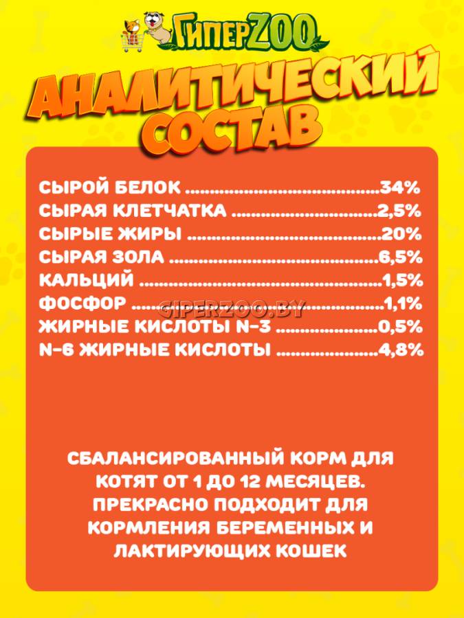 Аналитический Сырой белок: 34%, сырая клетчатка: 2,5%, сырые жиры: 20%, сырая зола: 6,5%, кальций: 1,5%, фосфор: 1,1%, соотношение кальций / фосфор: 1,3, жирные кислоты n-3: 0,5%, n-6 жирные кислоты: 4,8%, метаболическая энергия (расчет в воде): 4220 ккал / кг.