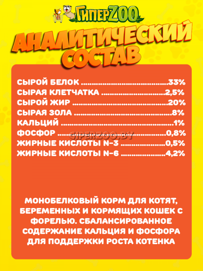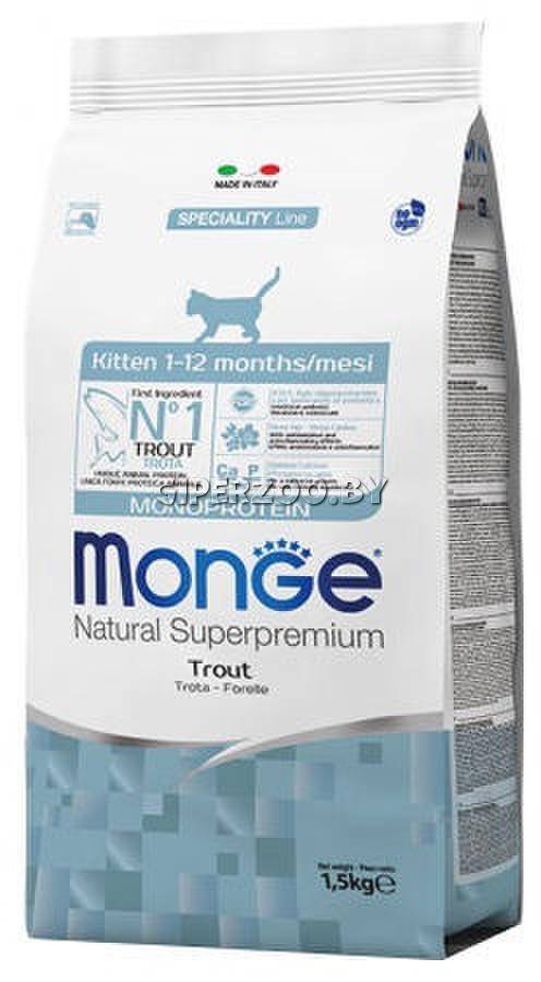 Monge Cat Monoprotein Kitten (Форель) - это монобелковый корм для котят с форелью. Сбалансированное содержание кальция и фосфора для поддержки роста котенка. Составлен с уникальным источником животного белка (форель), обогащенным естественными пребиотиками, которые сохраняют здоровье кишечника.
