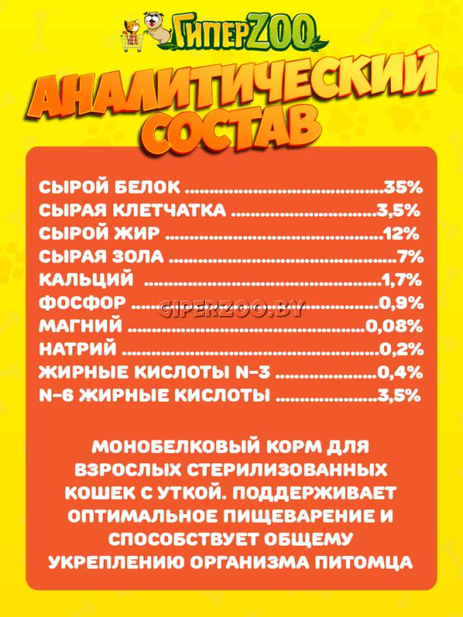 Состав: утка (26% обезвоженного мяса, 10% свежего мяса), кукурузный глютен, пшеница, кукуруза, гидролизованные животные белки (печень 4%), животный жир (утиный жир очищенный до 99,5%), гороховая клетчатка, минералы, дрожжевые продукты (манно- олигосахариды MOS 1%), ксило-олигосахариды (XOS 0,3%), продукты переработки трав (шиповник 0,1%), Yucca schidigera (0,1%).