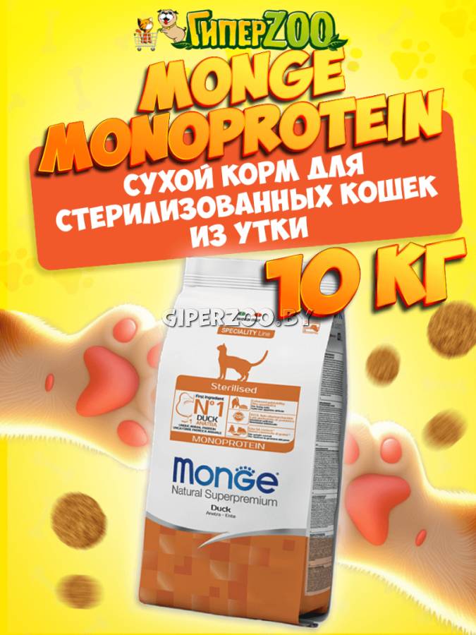 Monge Cat Monoprotein Sterilized (Утка) - это монобелковый корм для взрослых стерилизованных кошек с уткой. Благодаря использованию вкусного, ароматного мяса, необходимого количества минеральных веществ и витаминов, а также содержанию X.O.S. (ксилоолигосахаридов) – пребиотиков нового поколения, рационы Monge Monoprotein позволяют кошкам поддерживать оптимальное пищеварение и способствуют общему укреплению организма питомца.