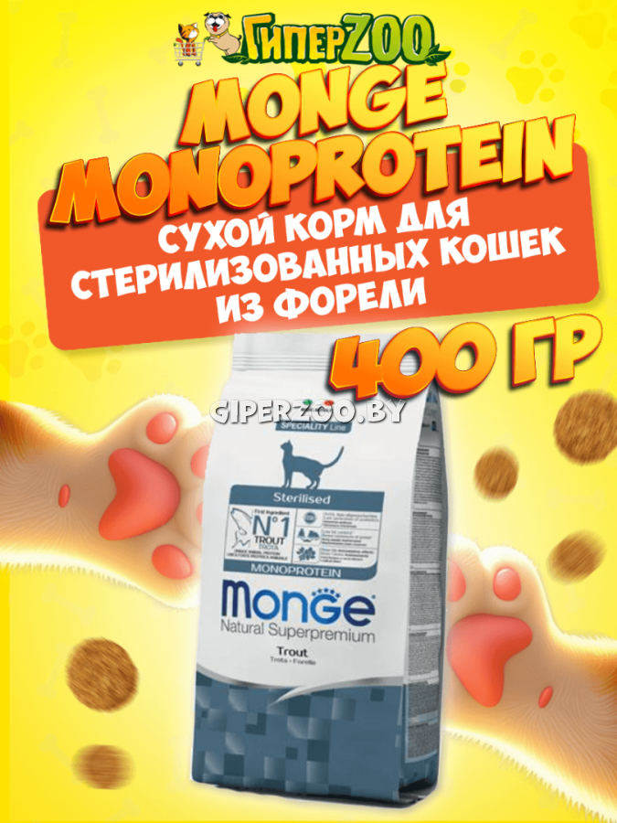 Monge Cat Monoprotein Sterilized (Форель) - это монобелковый корм для взрослых стерилизованных кошек и кастрированных котов с форелью. Помогает контролировать вес благодаря низкому содержанию жира. Составлен с уникальным источником животного белка (форель), обогащенным естественными пребиотиками, которые сохраняют здоровье кишечника.
