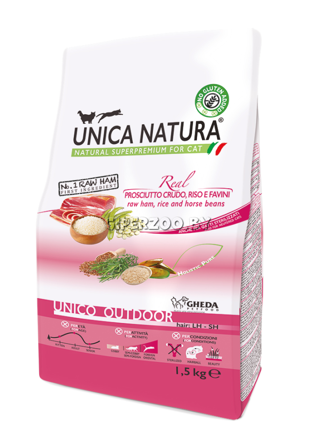 Unica Natura Unico Outdoor (ветчина, рис, бобы), 1,5 кг - это корм для кошек любого возраста, гуляющих на улице. составе всех кормов этой линейки обязательно присутствует льняное семя — важный источник Омега-3 жирной кислоты, повышающей блеск и мягкость шерсти, поддерживающей эластичность и гидробаланс кожи, и действующей в комплексе с Омега-6. Экстракт розмарина — эффективная комбинация антиоксидантов естественным образом, без использования BHA/BHT и искусственных консервантов, предотвращает окисление жиров в корме. Полезная нерастворимая клетчатка стимулирует процесс пищеварения, предотвращает образование волосяных комочков и способствует их выведению из ЖКТ. Зеленые мидии — источник природных хондропротекторов, влияющих на здоровье суставов и снижение суставной боли у кошек.