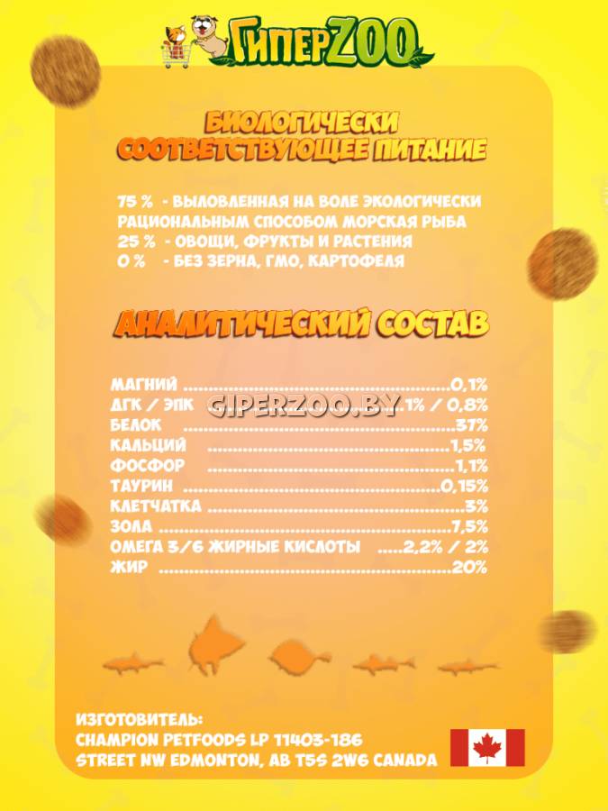 Свежая цельная сельдь (16%), свежая цельная тихоокеанская сардина (13%), свежая цельная камбала (8%), дегидрированная цельная сельдь (8%), дегидрированное мясо тихоокеанской трески (8%), дегидрированный цельный хек (8%), цельный зеленый горошек, цельная красная чечевица, цельный нут, цельная зеленая чечевица, жир сайды (6%), свежий цельный серебристый хек (4%), свежий цельный морской окунь (4%), цельная фасоль, цельный желтый горошек, подсолнечное масло холодного отжима, вяленная на солнце люцерна, сухие бурые водоросли, свежая столовая тыква, свежая мускатная тыква, свежий пастернак, свежая листовая капуста, свежий шпинат, свежие листья горчицы, свежая зелень репы, свежая морковь, свежие яблоки сорта «Ред Делишес», свежая груша сорта «Бартлетт», сублимированная печень трески (0,1%), свежая клюква, свежая черника, корень цикория, куркума, расторопша, корень лопуха, цветы лаванды, корень алтея, плоды шиповника.