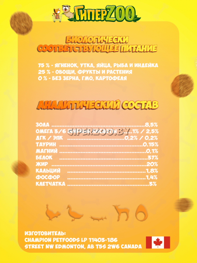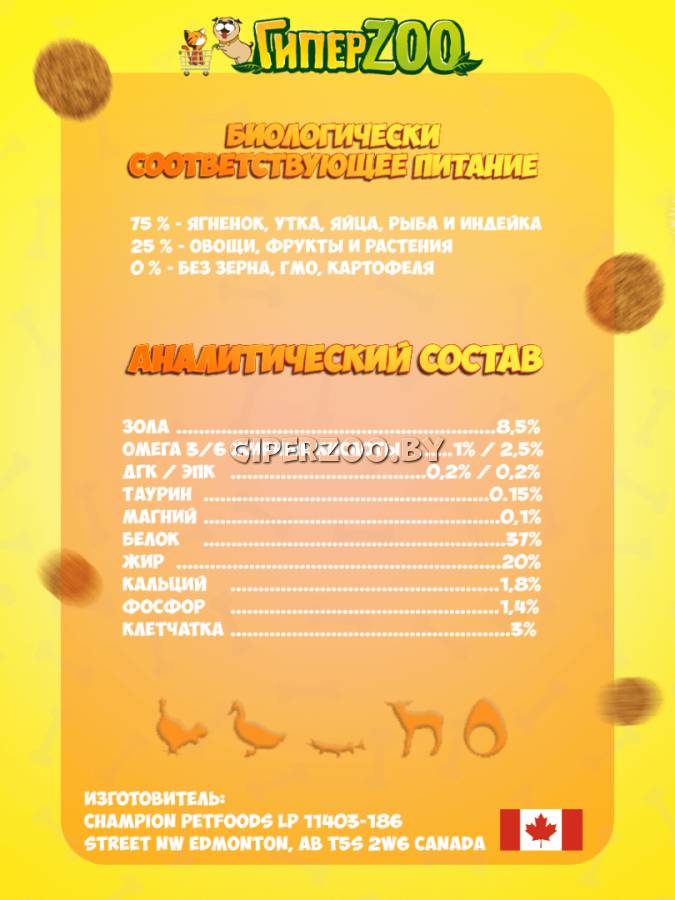 Сырое мясо ягненка (8%), свежее мясо утки (8%), свежие цельные яйца (8%), дегидрированное мясо ягненка (8%), цельная дегидрированная сельдь (8%), дегидрированное мясо индейки (8%), цельный зеленый горошек, цельная красная чечевица, цельный нут, жир ягненка (6%), свежая северная щука (5%), сырая печень ягненка (4%), свежие утиные потрошки (печень, сердце, почки) (4%), свежее мясо индейки без костей (4%), цельная зеленая чечевица, цельная фасоль, цельный желтый горошек, жир сайды (2%), вяленная на солнце люцерна, сушеные хрящи ягненка (1%), сырой рубец ягненка (1%), сухие бурые водоросли, свежая столовая тыква, свежая мускатная тыква, свежий пастернак, свежая листовая капуста, свежий шпинат, свежие листья горчицы, свежая зелень репы, свежая морковь, свежие яблоки сорта «Ред Делишес», свежая груша сорта «Бартлетт», сублимированная печень ягненка (0,1%), свежая клюква, свежая черника, корень цикория, куркума, расторопша, корень лопуха, цветы лаванды, корень алтея, плоды шиповника.