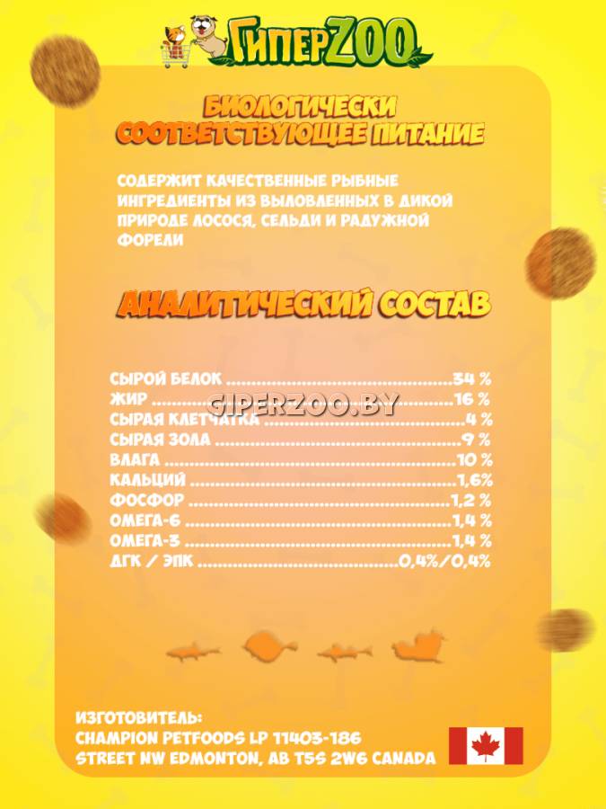 сырое мясо лосося (15%), дегидрированное мясо лосося (15%), дегидрированная сельдь (15%), сырой цельный хек (4%), сырая цельная сельдь (4%), цельный овес, цельный горох, масло сайды (8%), цельная зеленая чечевица, цельный нут, цельная красная чечевица, сырая радужная форель (2%), масло лосося (2%), подсолнечное масло, сушеные водоросли, свежая мускатная тыква, свежая тыква, цельная свежая клюква, цельная свежая черника.