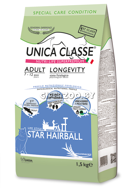 Unica Classe Adult Longevity Star Hairball (Форель) - полноценный корм для взрослых кошек в возрасте от 7 до 12 лет с форелью. Корм включает комплекс витаминов E и C для противодействия свободным радикалам, имеет мало фосфора для здоровья почек, имеет пониженное содержание магния для здоровья мочевыводящих путей и содержит гороховую клетчатку для облегчения отхождения комков шерсти. содержит животный белок в качестве первого компонента цельнозерновой рис – как самый перевариваемый злак с контролируемым гликемическим индексом низкий уровень углеводов питательный состав содержит Юкку Шидигера – мощный природный дезодорант, уменьшающий запахи из лотка без искусственных ароматизаторов, красителей и сои