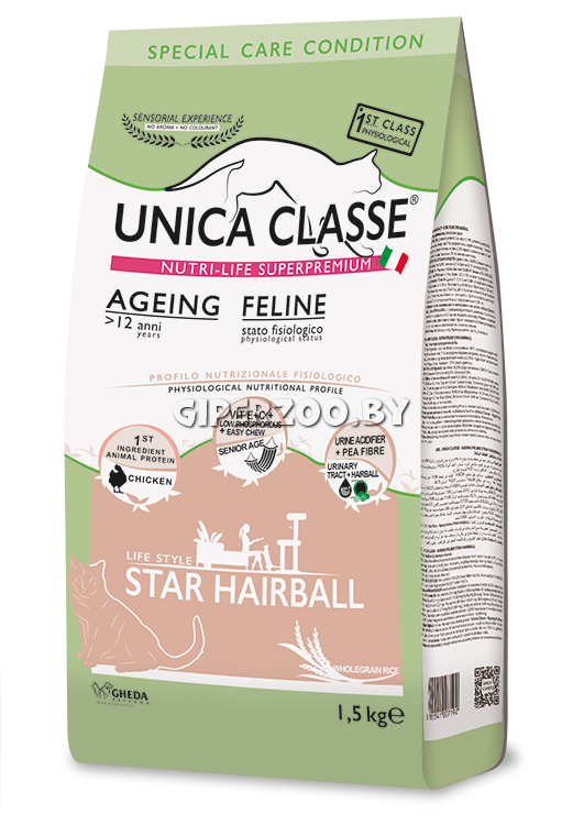 Unica Classe Ageing Feline Star Hairball (курица), 1,5 кг - это полноценный корм для пожилых кошек старше 12 лет с курицей.