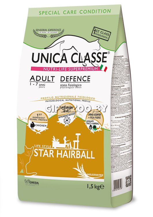 Unica Classe Adult Defence Star Hairball (Курица) - это полноценный корм для взрослых кошек в возрасте от 1 до 7 лет с курицей. Корм включает комплекс витаминов E и C для усиления антиоксидантной защиты, имеет пониженное содержание магния для здоровья мочевыводящих путей и содержит гороховую клетчатку для облегчения выведения комков шерсти. содержит животный белок в качестве первого компонента цельнозерновой рис – как самый перевариваемый злак с контролируемым гликемическим индексом низкий уровень углеводов содержит Юкку Шидигера – мощный природный дезодорант, уменьшающий запахи из лотка без искусственных ароматизаторов, красителей и сои