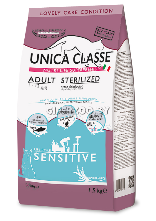 Unica Classe Adult Sterilized Sensitive (тунец), 1,5 кг- полноценный корм для взрослых стерилизованных кошек в возрасте от 1 до 12 лет с тунцом.