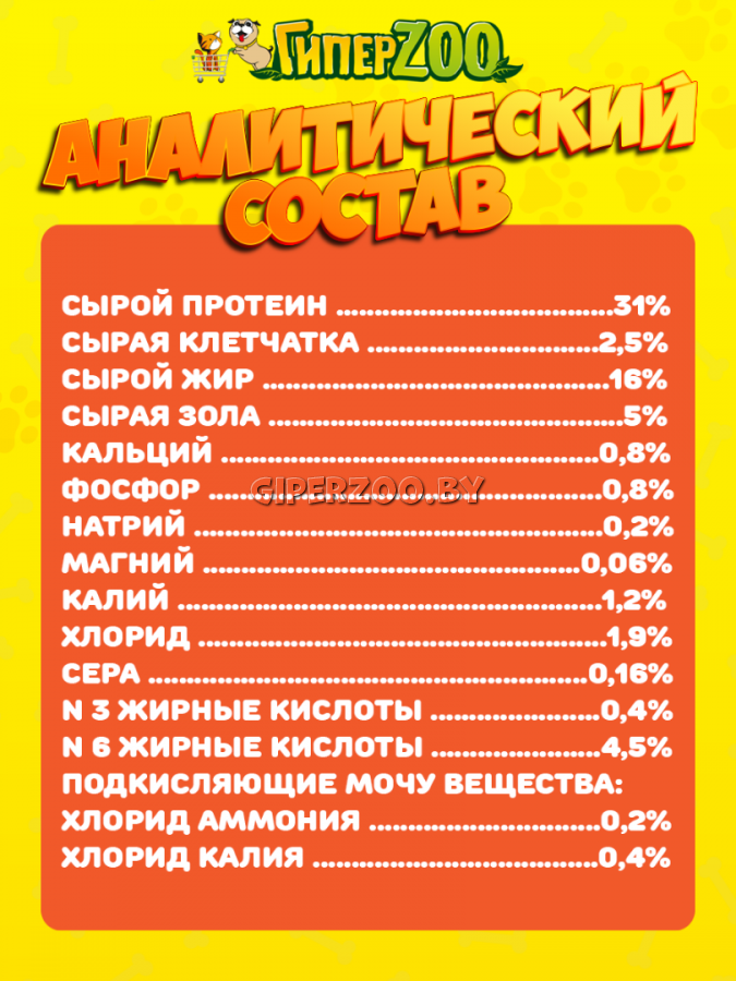 Корм имеет сбалансированное содержание магния, кальция и фосфора, за счет чего улучшается функционирование мочевыводящих путей.