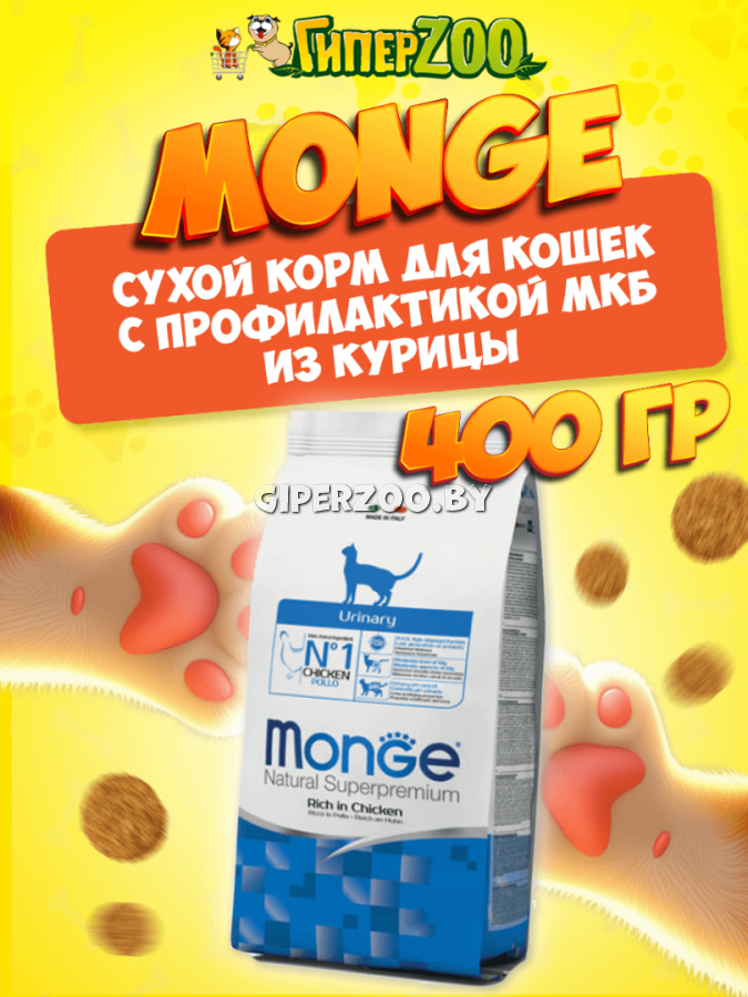 Monge Urinary cat (цыпленок), 0,4 кг - это сбалансированный рацион для взрослых кошек, служащий профилактикой мочекаменной болезни, а также помогающий предотвратить образование кристаллов и камней в мочевом пузыре.