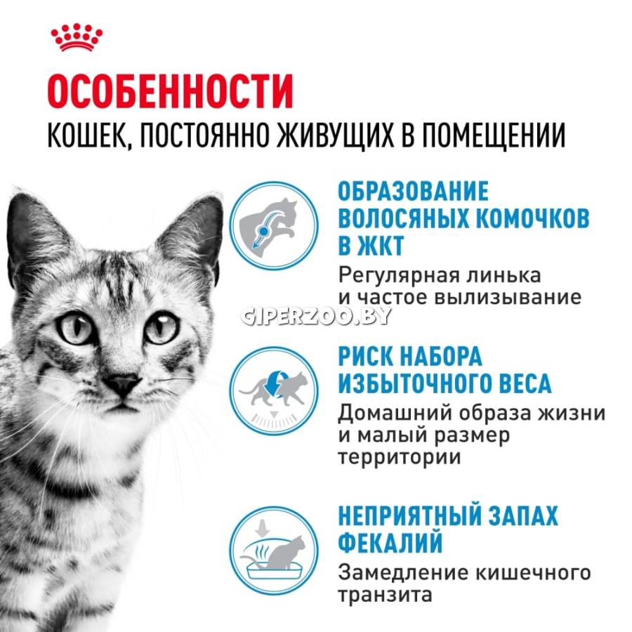 Взрослые кошки, постоянно содержащиеся в помещении, менее активны по сравнению с животными, имеющими доступ на улицу. Вот почему для их здоровья так важен полноценный сбалансированный рацион, богатый ценными питательными веществами. ROYAL CANIN® Indoor 27 содержит белки высокой усвояемости (L.I.P.), уменьшающие объем и неприятный запах стула (последнее особенно актуально для малоактивных кошек в связи с замедленным кишечным транзитом). Умеренное содержание жиров в продукте обеспечивает соответствие между потреблением и расходованием энергии и сохранение нормального веса. Как правило, кошки, живущие в помещении, долго и тщательно ухаживают за шерстью. Благодаря присутствию в составе корма нескольких видов пищевой клетчатки, в частности семян подорожника, облегчается выведение из пищеварительного тракта проглоченной шерсти и снижается вероятность образования волосяных комочков. Состав:пшеница, рис, дегидратированные белки животного происхождения (птица), изолят растительных белков*, мука из зерновых культур.