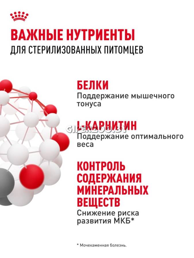 После стерилизации необходимо пересмотреть рацион кошки с учетом изменившихся потребностей в энергии. Royal Canin Sterilised 37 помогает снизить риск появления избыточного веса, благодаря умеренному содержанию жиров, при соблюдении рекомендуемых норм кормления. Тщательно выверенное количество минеральных веществ в составе Royal Canin Sterilised 37 способствует поддержанию здоровья мочевыделительной системы кошки, а повышенный уровень белка помогает сохранять оптимальную мышечную массу. Состав: дегидратированные белки животного происхождения (птица), изолят растительных белков*, пшеница, мука из зерновых культур, растительная клетчатка, животные жиры, гидролизат белков животного происхождения (вкусоароматические добавки), рис, минеральные вещества, рыбий жир, дрожжи и побочные продукты брожения, соевое масло, фруктоолигосахариды, хлорид аммония.