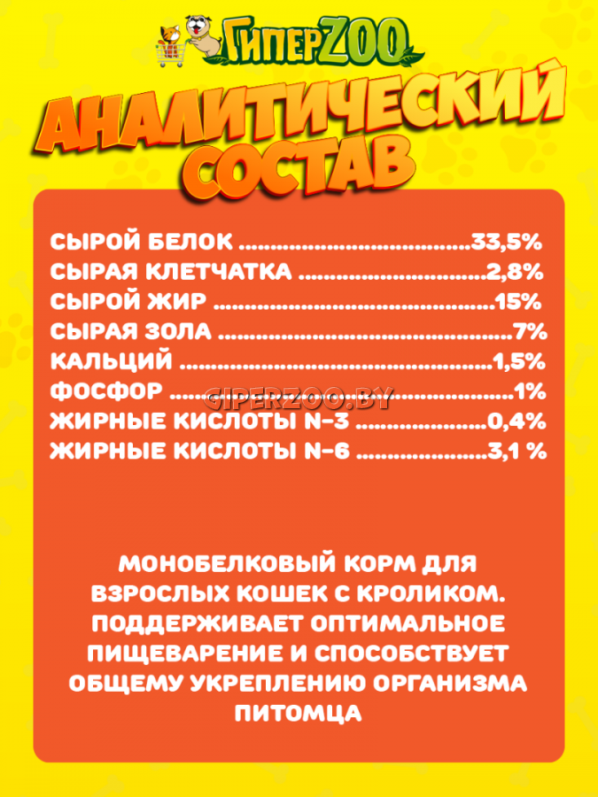 Состав: кролик (сушеный 26%, свежее мясо 10%), рис, кукурузный глютен, картофель, гидролизованные животные белки (печень), животный жир (куриное масло очищенное до 99,5%), сушеный свекольный жом, пивные дрожжи, гороховое волокно, минералы, дрожжи продукты (маннано-олигосахариды MOS 1%), ксилоолигосахариды (XOS 0,3%), юкка шидигера (0,1%), продукты переработки трав (шиповник 0,1%).