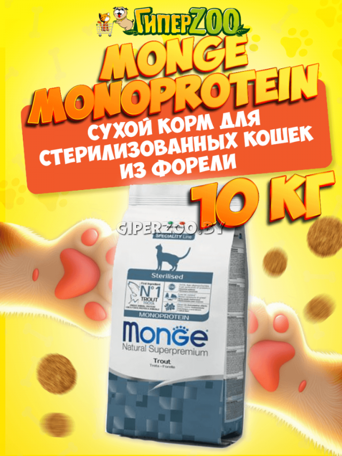 Сухой корм для стерилизованных котов Monge Cat Monoprotein Sterilized (Форель), 10 кг - это монобелковый корм для взрослых стерилизованных кошек и кастрированных котов с форелью. Помогает контролировать вес благодаря низкому содержанию жира.