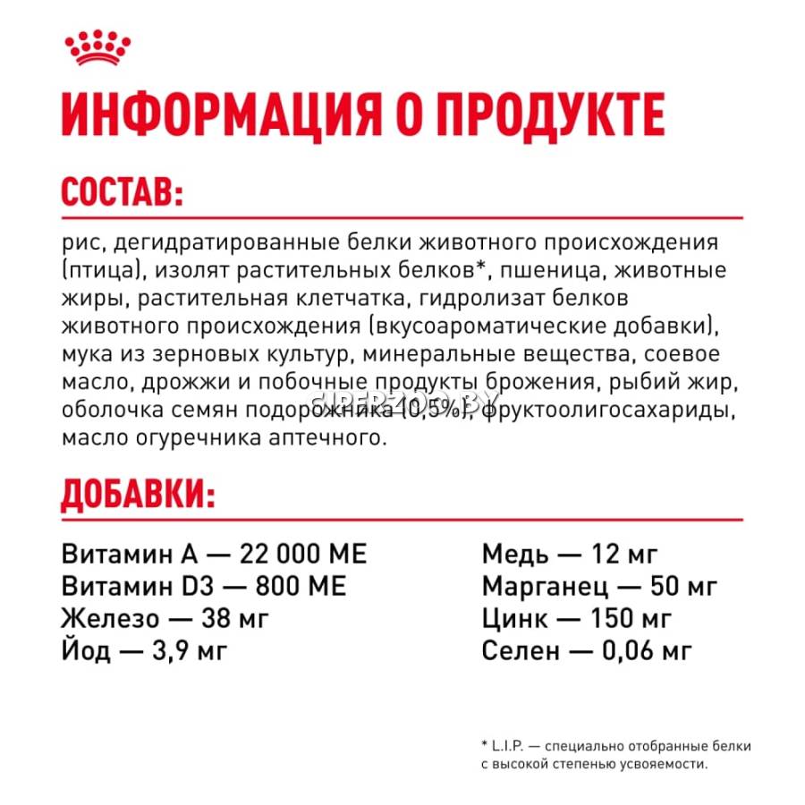 рис, дегидратированные белки животного происхождения (птица), изолят растительных белков*, пшеница, животные жиры, растительная клетчатка, гидролизат белков животного происхождения (вкусоароматические добавки), мука из зерновых культур, минеральные вещества, соевое масло, дрожжи и побочные продукты брожения, рыбий жир, оболочки и семена подорожника (0,5 %).