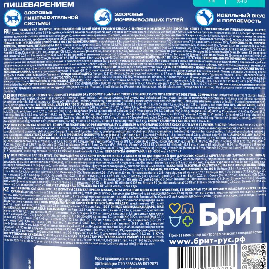 Брит Премиум Сухой корм для взрослых кошек с чувствительным пищеварением с ягненком и индейкой Cat Sensitive (Brit Premium) — предназначен для взрослых кошек с чувствительным пищеварением. Сбалансированный состав содержит все витамины и минералы, необходимые для ежедневного здорового питания вашего питомца. Корм поможет сохранить здоровье и активность вашего питомца, а мясо в составе обеспечивает притягательный аромат и вкус, который не оставит равнодушным даже самых привередливых питомцев.