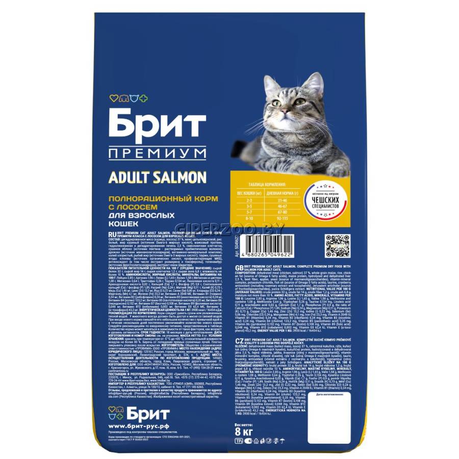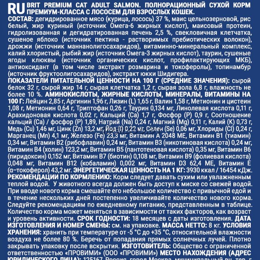 Брит Премиум Сухой корм для взрослых кошек с лососем Cat Adult Salmon (Brit Premium) - предназначен для взрослых кошек всех пород. Сбалансированный состав содержит все витамины и минералы, необходимые для ежедневного здорового питания вашего питомца. Корм поможет сохранить здоровье и активность вашего питомца, а лосось в составе обеспечивает притягательный аромат и вкус, который не оставит равнодушным даже самых привередливых питомцев.
