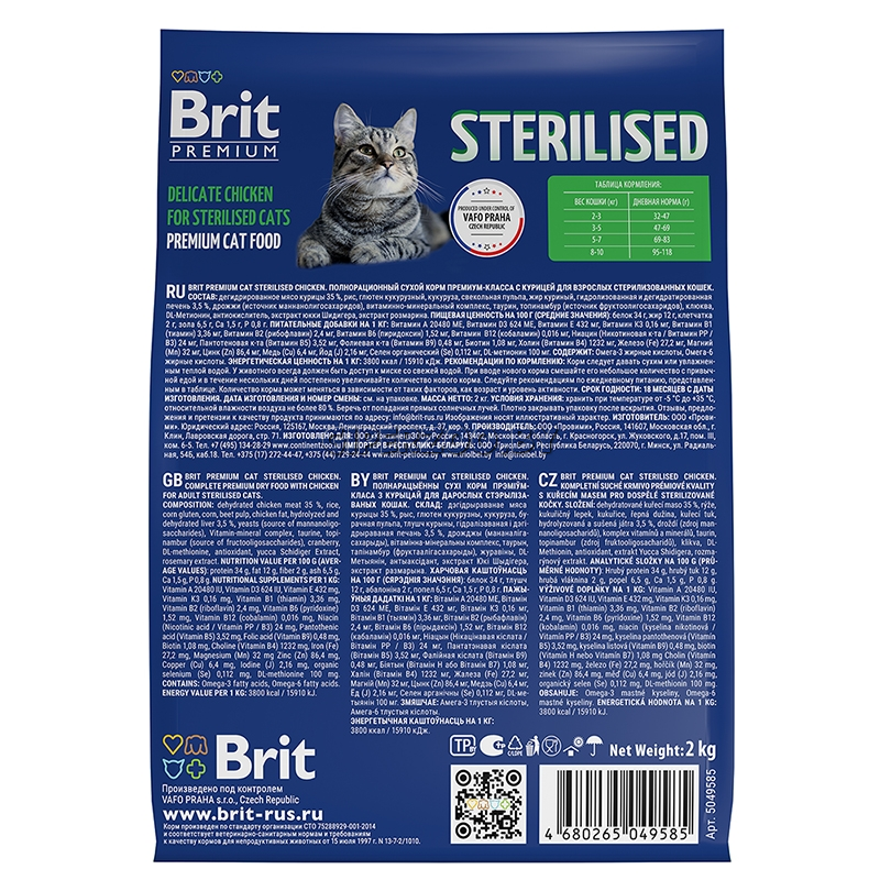 Brit Premium Sterilised (Курица), 2 кг - предназначен для взрослых стерилизованных кошек. Сбалансированный состав содержит все витамины и минералы, необходимые для ежедневного здорового питания вашего питомца. Корм поможет сохранить здоровье и активность вашего питомца, а мясо в составе обеспечивает притягательный аромат и вкус, который не оставит равнодушным даже самых привередливых питомцев.